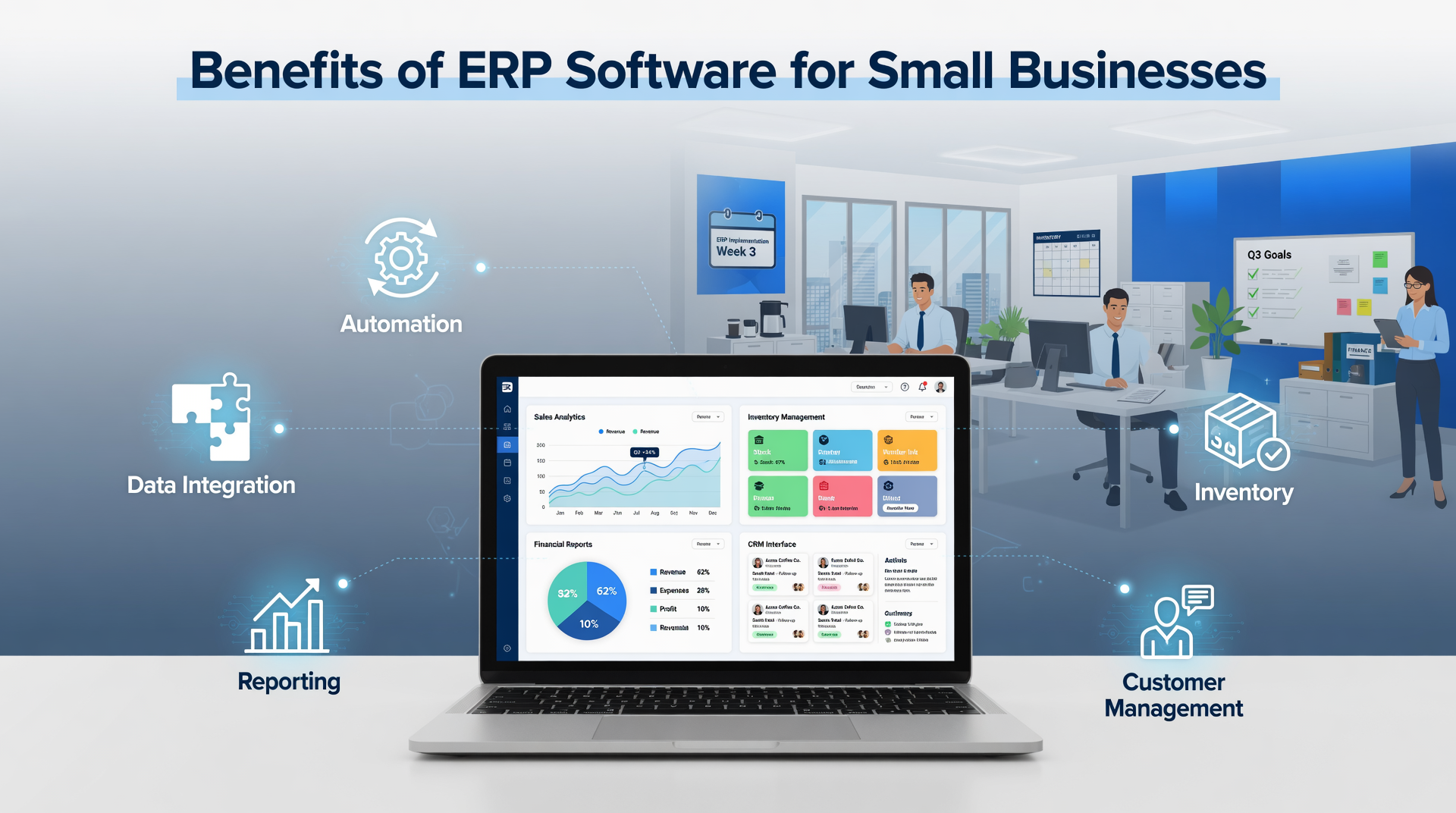 ERP software provides many benefits for small businesses, including improved efficiency, better financial management, inventory control, customer management, real-time reporting, and cost reduction. ERP helps small businesses automate daily operations and manage business processes more effectively.